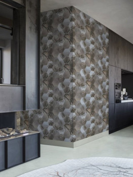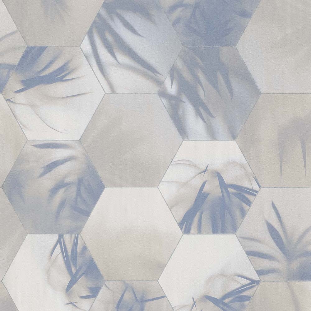Geometrické vzory v netradičním spojení s přírodními motivy dodají vašemu interiéru moderní a originální vzhled. Metalické obrysy hexagonů s rostlinnými motivy v modrých a šedých odstínech.