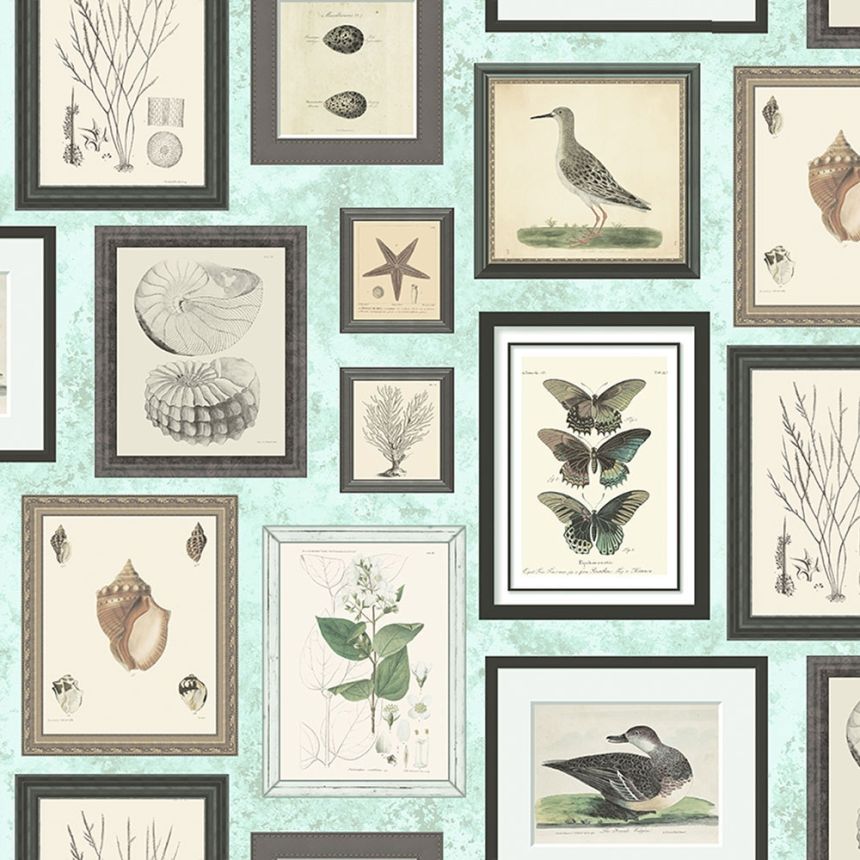 Vliesová, omyvatelná tapeta s rámovanými obrázky rostlin a živočichů v odstínech šedé, hnědé a tyrkysové.