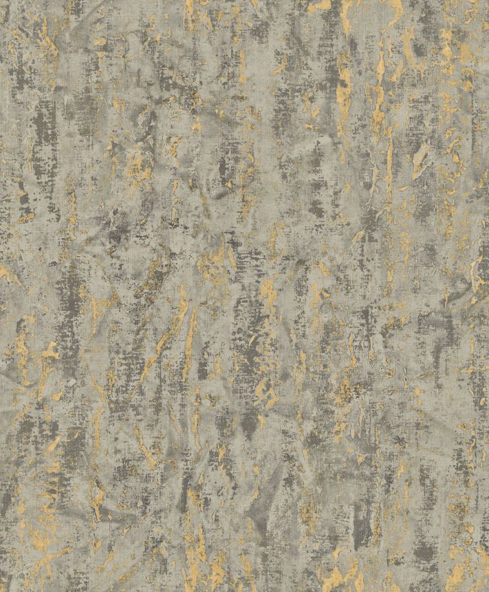 Luxusní šedo-zlatá vliesová tapeta, imitace plastické štukové omítky se zlatými a stříbrnými odlesky.