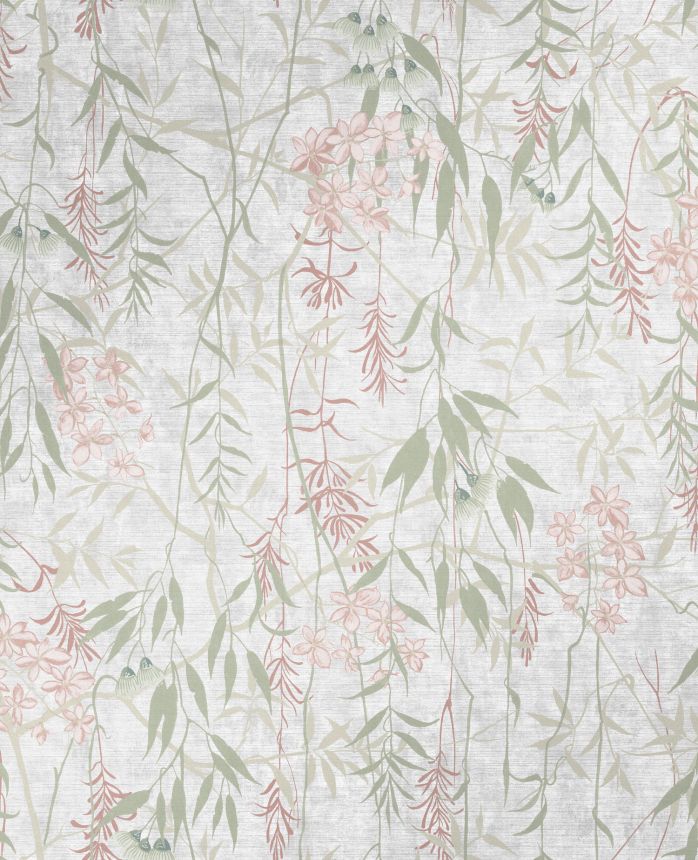Pololesklá béžová vliesová tapeta na zeď, květiny a listy v odstínech zelené a růžové.