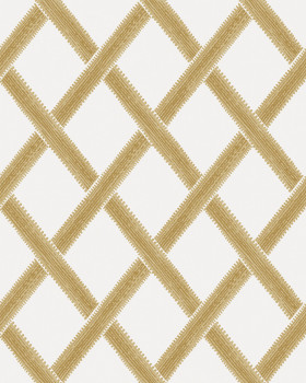 Bílá vliesová tapeta na zeď, okrový proplétaný vzor.