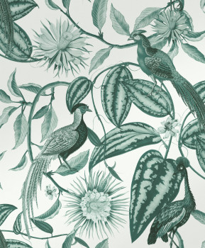 Pololesklá vliesová tapeta na zeď, šedo-stříbrný podklad, zelené motivy květin, listů a ptáků.