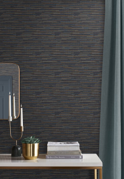 Vliesová tapeta na zeď, imitace tkané rustikální textilie v odstínech modré, hnědé a cihlově červené.