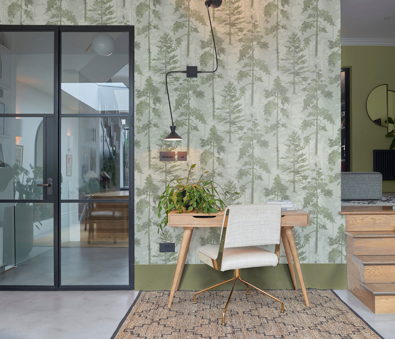 Šedo-zelená vliesová tapeta na zeď, motiv lesa, stromů.