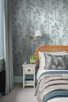 Šedo-modrá vliesová tapeta na zeď, motiv lesa, stromů.