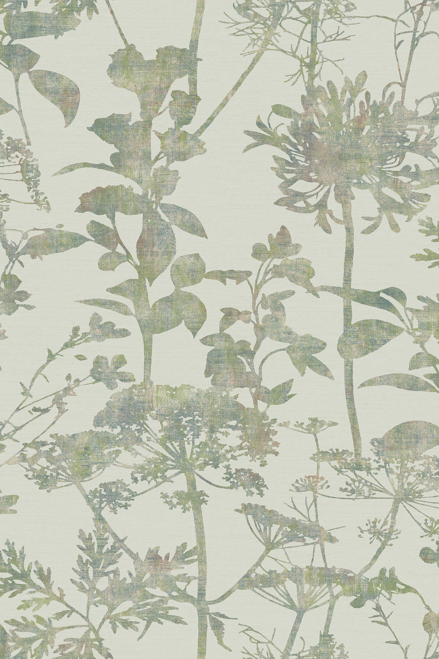 Šedá vliesová tapeta na zeď, motiv luční trávy v odstínech zelené, nádech modré a béžové.