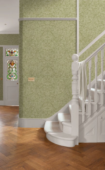 Pololesklá vliesová tapeta s listy, odstíny zelené a béžové.