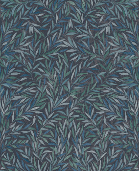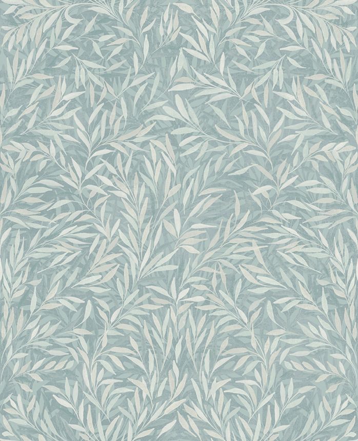 Pololesklá vliesová tapeta s listy, odstíny šedé a šedo-modré.