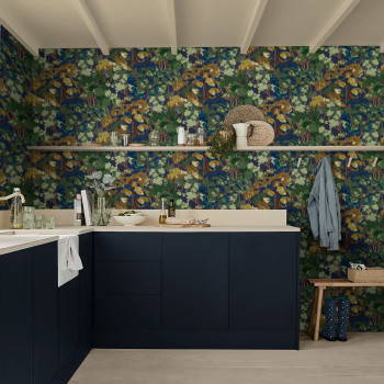 Modrá vliesová tapeta na zeď, motiv lesa, stromů v odstínech zelené, modré, hnědé, šedé a okrové.