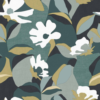 Luxusní vliesová tapeta s vinylovým povrchem, motiv bílých květů s listy, odstíny zelené, béžové a černé. Foto interiéru je pouze ilustrační - odlišné barvy.