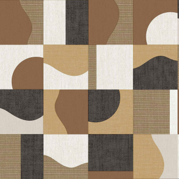 Luxusní vliesová geometrická tapeta s vinylovým povrchem, motiv kostek s tvary, odstíny hnědé, béžové a černé barvy. Foto interiéru je pouze ilustrační - odlišné barvy.