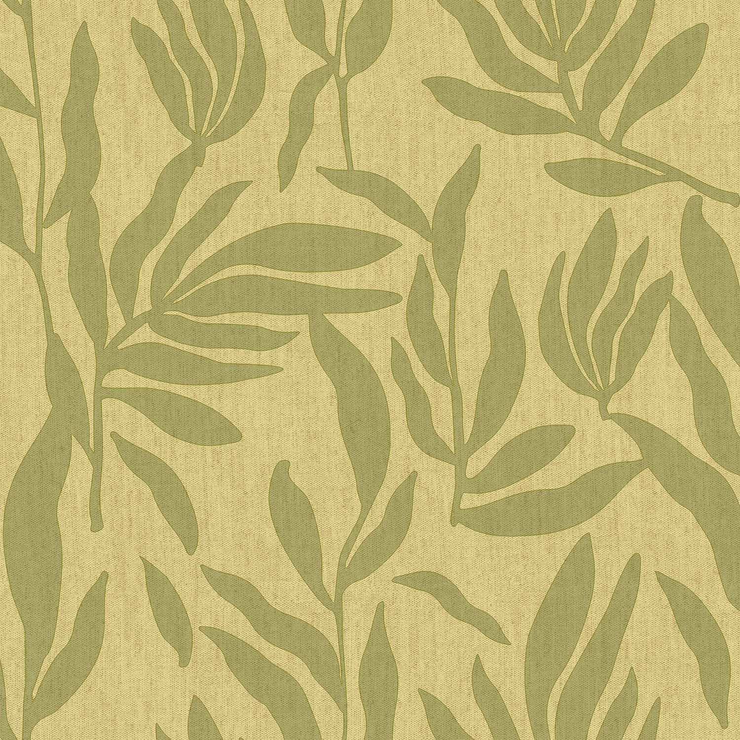 Luxusní žlutá vliesová tapeta s vinylovým povrchem, motiv větviček s listy v zelené barvě. Foto interiéru je pouze ilustrační - odlišné barvy.