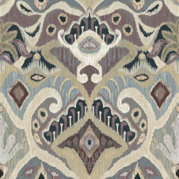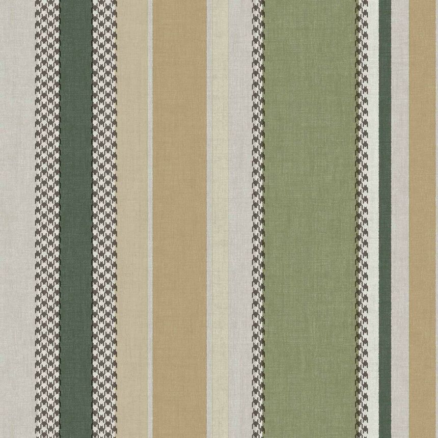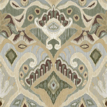 Luxusní zelená vliesová tapeta s vinylovým povrchem, geometrický motiv evokujicí etno vzor, odstíny zelené, béžové, šedé a vínové, textura pruhů. Foto interiéru je pouze ilustrační - odlišné barvy.
