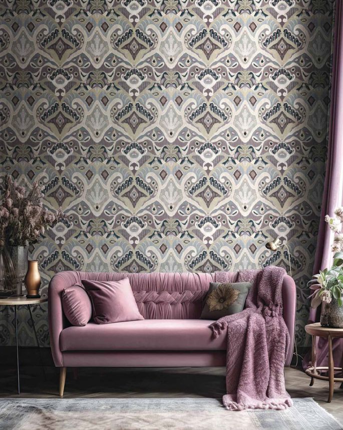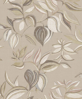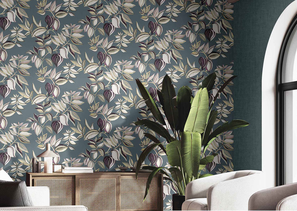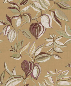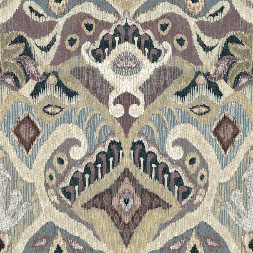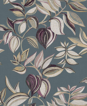 Luxusní tyrkysová vliesová tapeta s vinylovým povrchem, motivy listů, odstíny vínové, béžové a pískové, látková textura.