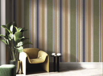 Luxusní vliesová tapeta s vinylovým povrchem, pruhy v zelené, modré a odstínech béžové barvy.