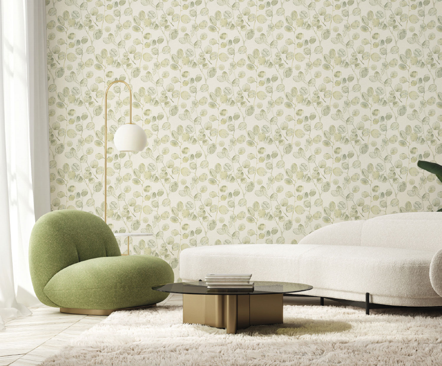 Krémová vliesová tapeta s vinylovým povrchem s látkovou texturou, pololesklé zelené větvičky a lístky.