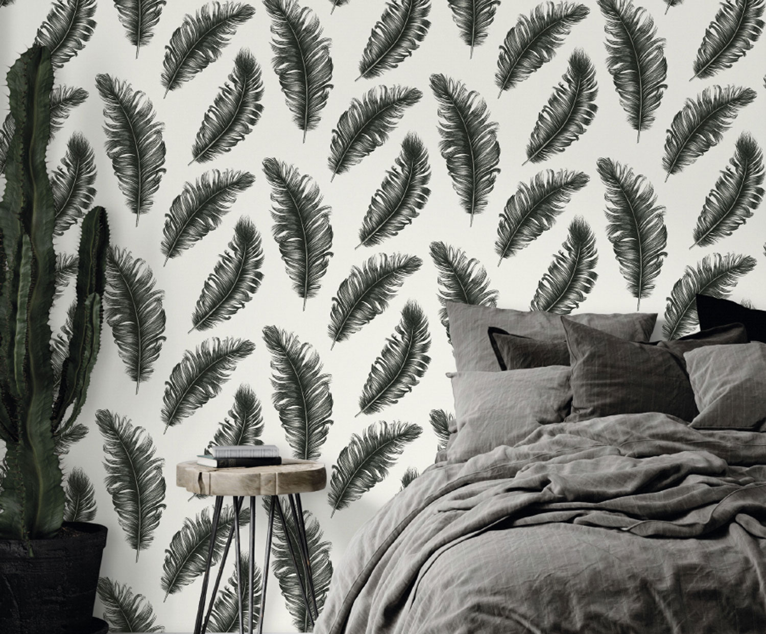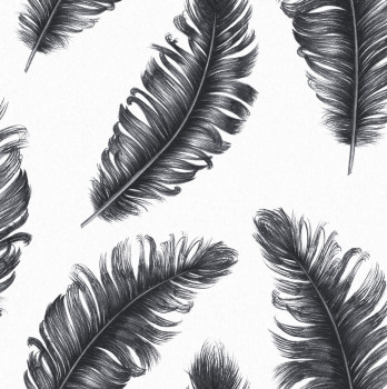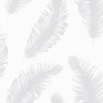 Perlově šedá vliesová tapeta s vinylovým povrchem a hrubší textilní strukturou, motiv pololesklých šedých peříček.