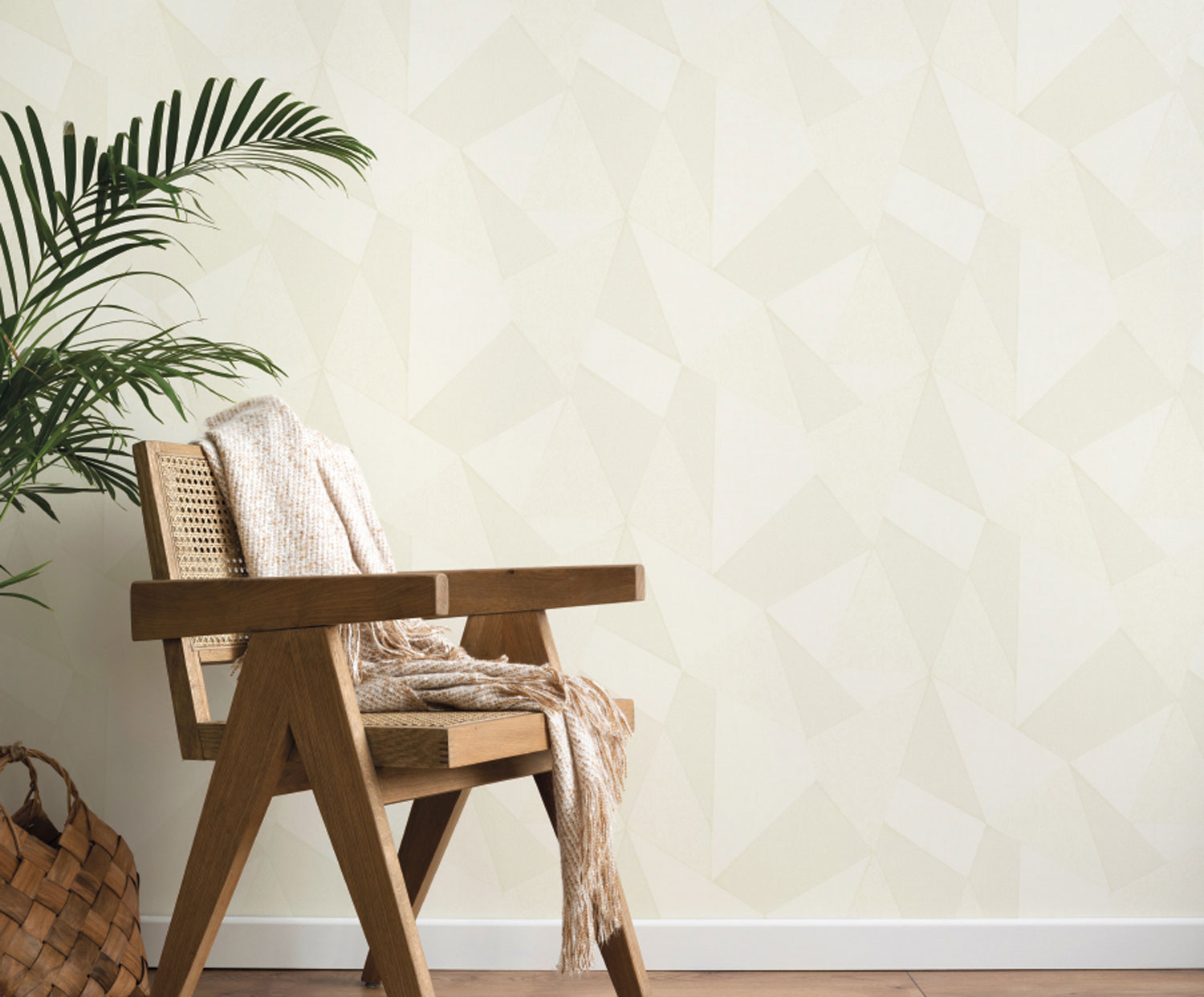 Pololesklá krémová jemně plastická vliesová tapeta s vinylovým povrchem, geometrcický vzor, místy zlaté třpytky.