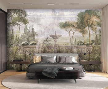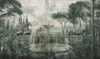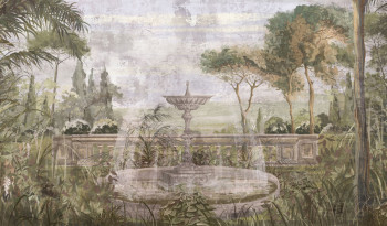 Luxusní vliesová obrazová tapeta s plastickým textilním povrchem, motiv zahrady s fontánou.