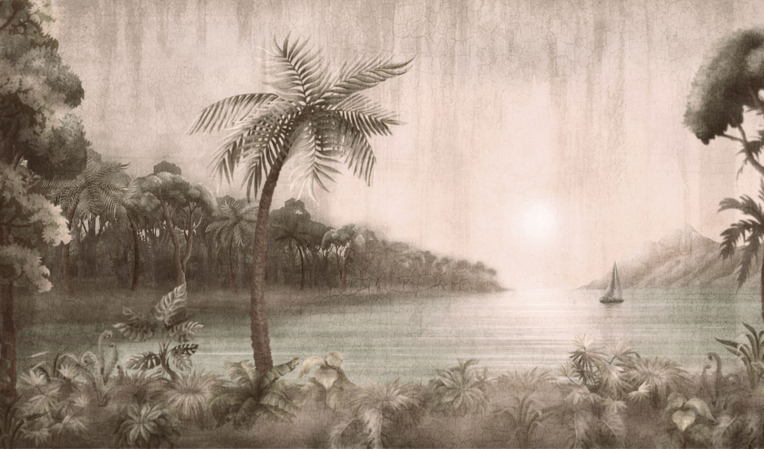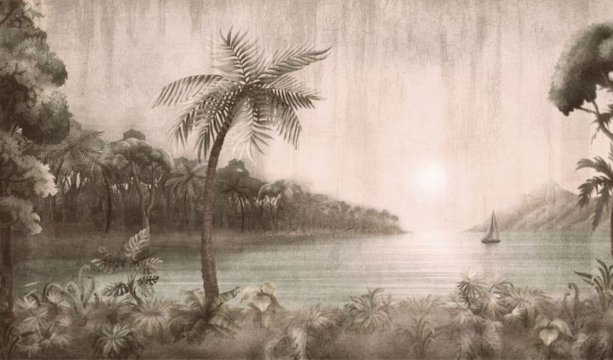Luxusní vliesová obrazová tapeta s plastickým textilním povrchem, motiv palem a moře.