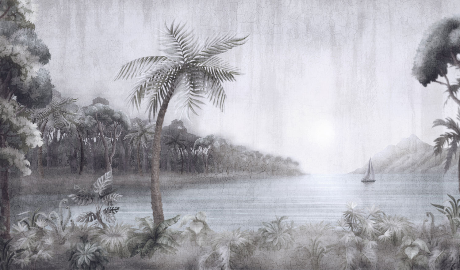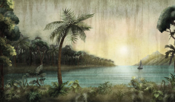 Luxusní vliesová obrazová tapeta s plastickým textilním povrchem, motiv palem a moře.