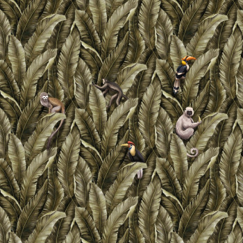 Luxusní vliesová obrazová tapeta s plastickým textilním povrchem, motiv listů, opiček a ptáků.