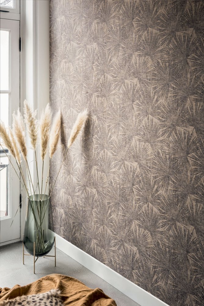 Vliesová tapeta s palmovými listy. Imitace hrubší látky, odstíny šedo-béžové.