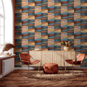 Hladká vliesová tapeta s vinylovým povrchem, barevné bloky v odstínech hnědé, béžové a okrové.