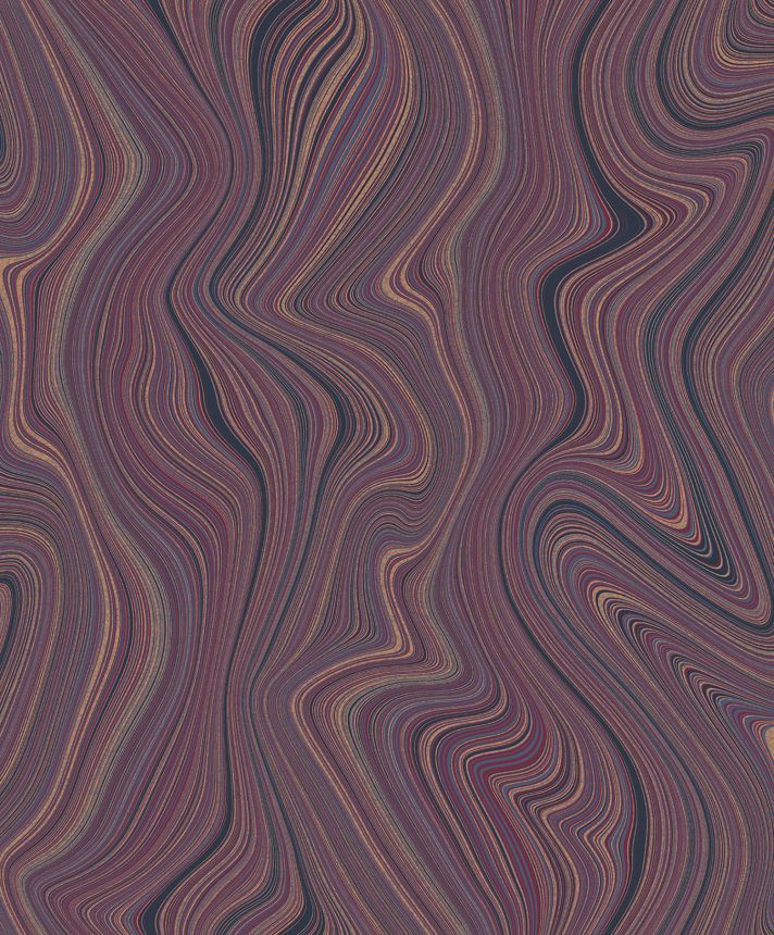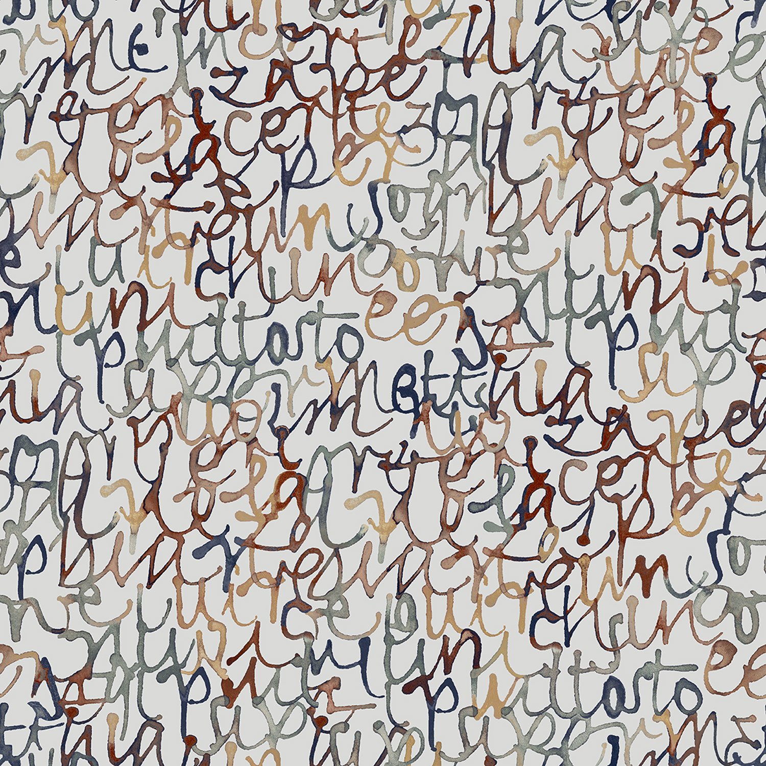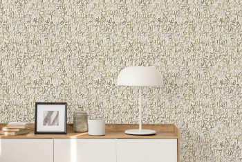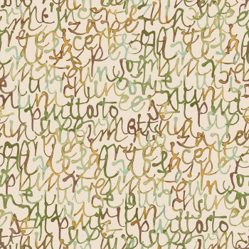 Vliesová tapeta s vinylovým povrchem, šedo-modrý podklad, abstraktní nápisy štětcem v odstínech modré, zelené, okrové a vínové.