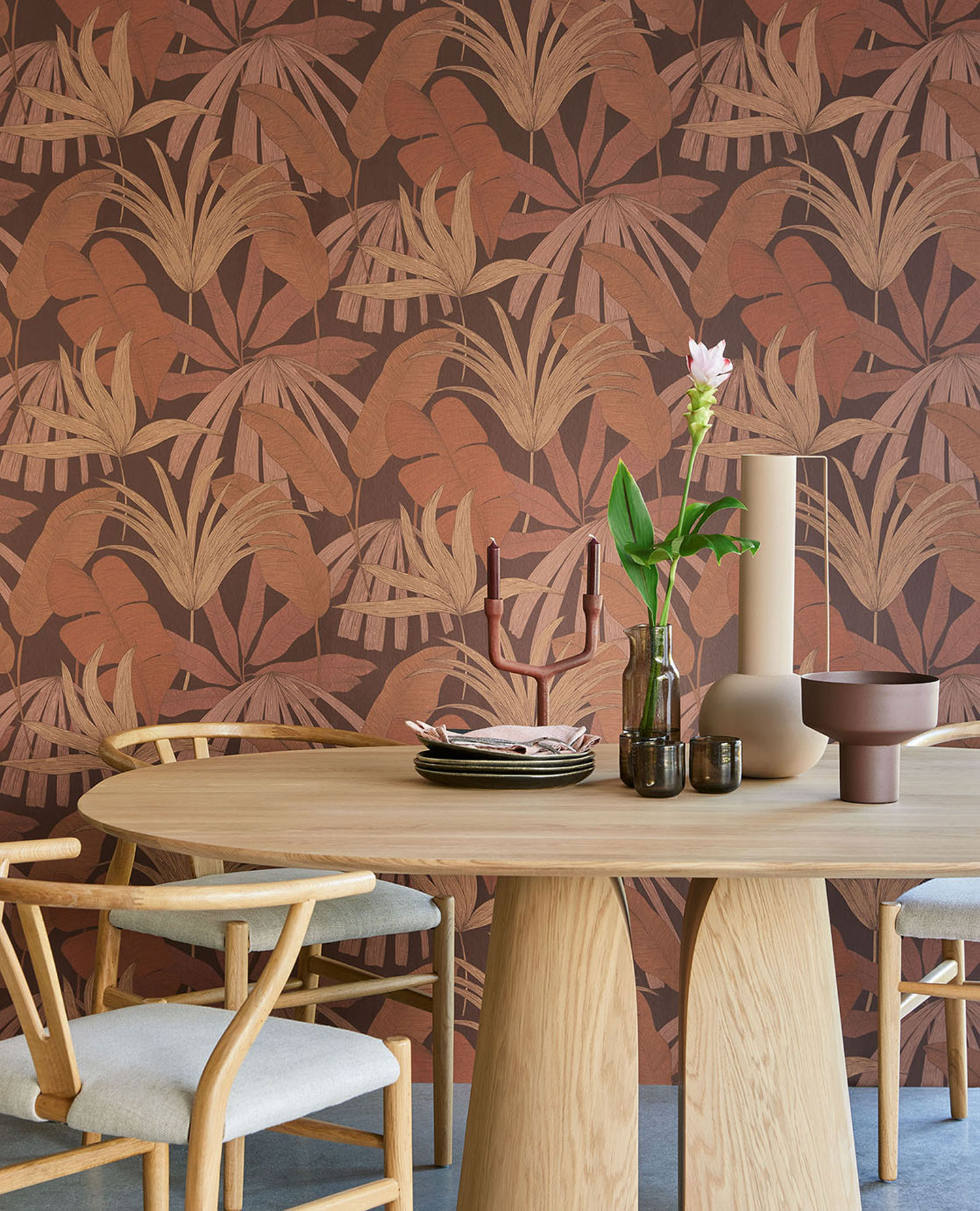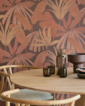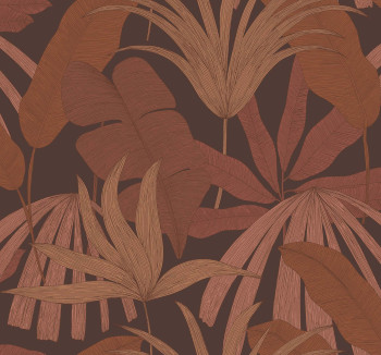 Hladká vínová vliesová tapeta na zeď, tropické palmové listy v odstínech terakota a hnědé.