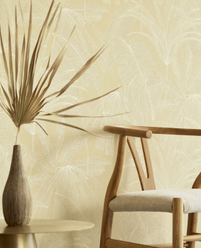 Hladká matná krémová vliesová tapeta na zeď, tropické palmové listy v odstínech lesklé perlové.