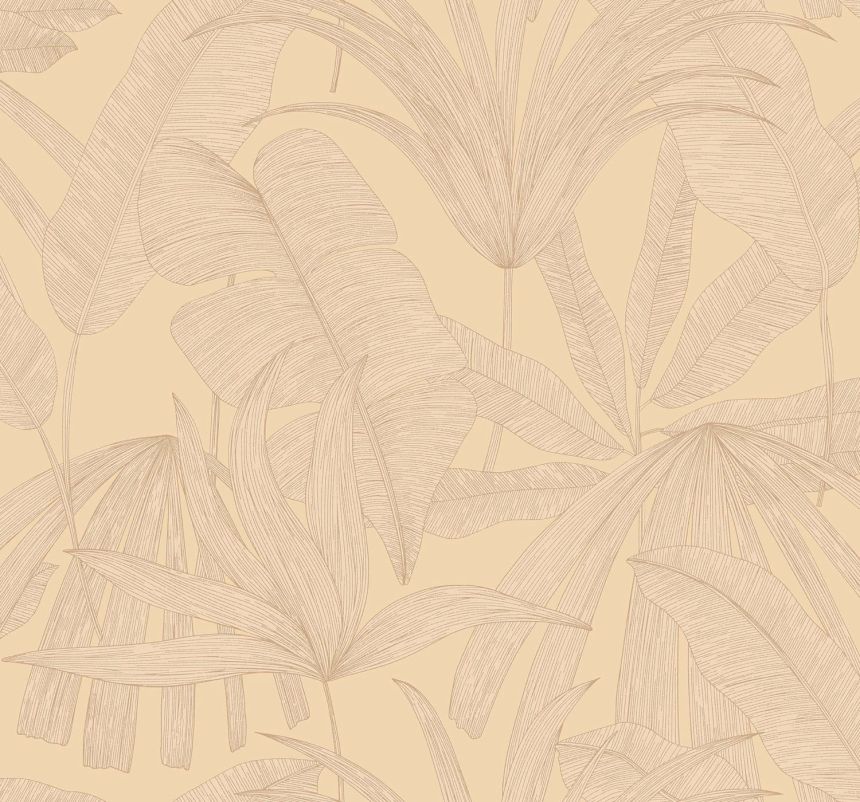 Hladká okrová vliesová tapeta na zeď, zlaté obrysy tropických palmových listů.