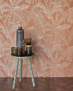 Hladká hnědá vliesová tapeta na zeď, metalické obrysy tropických palmových listů.