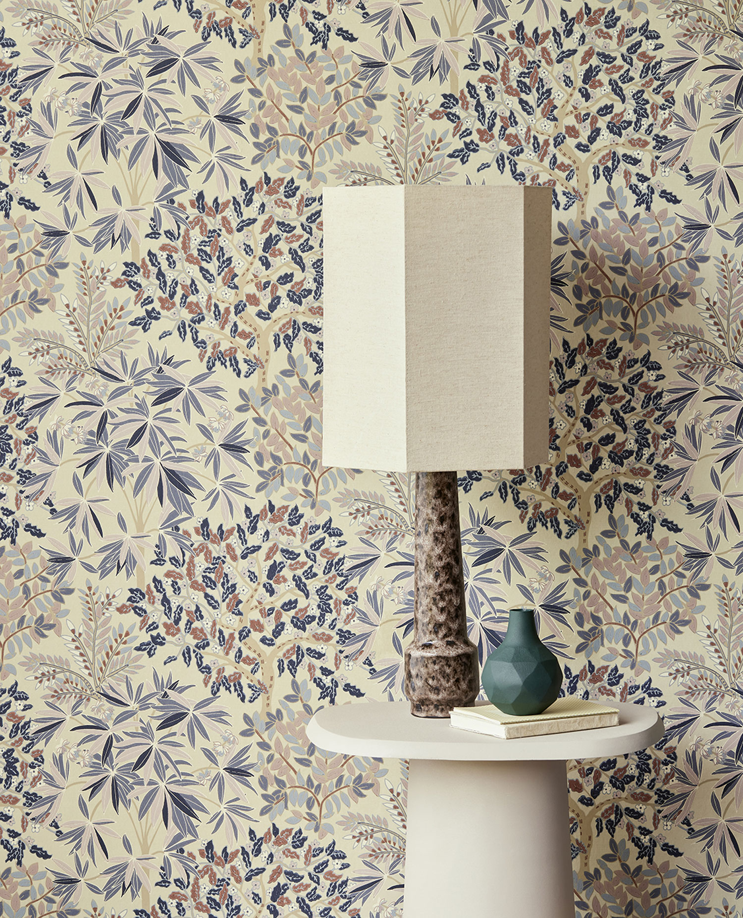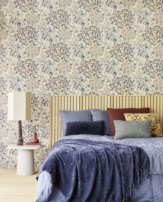 Béžová, jemně strukturovaná, vliesová tapeta na zeď, větvičky a listy v odstínech růžové, modré, lila a hnědé.