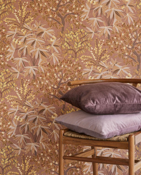 Růžová, jemně strukturovaná, vliesová tapeta na zeď, větvičky a listy v odstínech hnědé, okrové a lila.