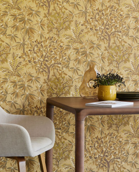 Okrová, jemně strukturovaná, vliesová tapeta na zeď, větvičky a listy v odstínech hnědé, béžové, khaki a hnědé.