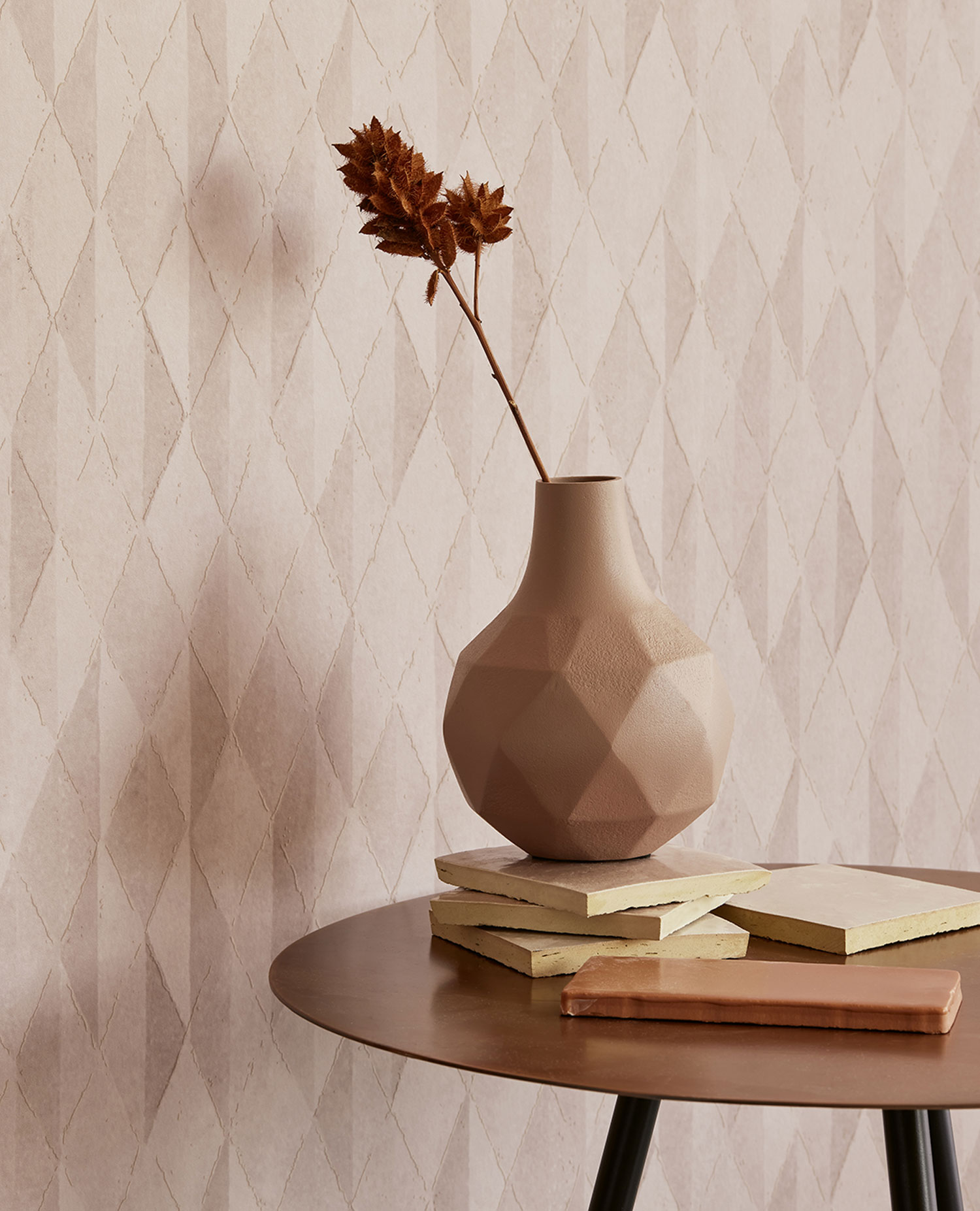 Růžová, geometrická vliesová tapeta na zeď, jemně plastické obrysy kosočtverců.