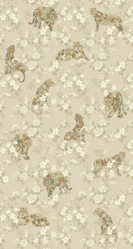 Béžová obrazová vliesová tapeta na zeď, motivy kočkovitých šelem a květin.