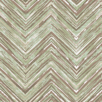 Vliesová tapeta na zeď, geometrický cik cak vzor v odstínech zelené, béžové a zlaté.