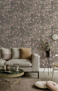 Vliesová tapeta na zeď, design rozkvetlých třešňových větviček, tmavě hnědý podklad, větvičky v odstínech hnědé.