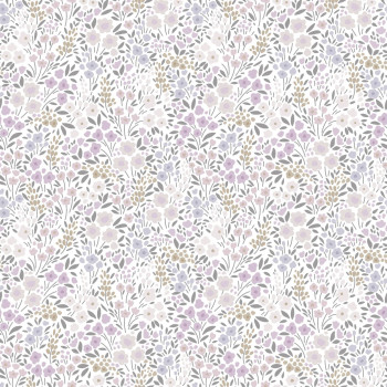 Hladká vliesová tapeta na zeď, květinový vzor v odstínech lila, béžové a šedé.