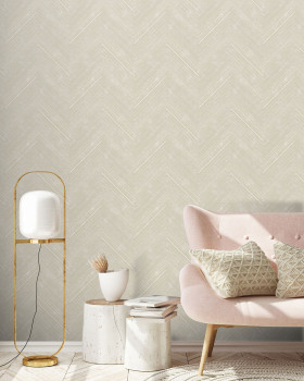 Vliesová tapeta s vinylovým povrchem, látková textura, cik cak vzor, odstíny béžové, šedé a krémové.