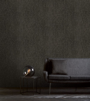 Vliesová tapeta s vinylovým povrchem, imitace hadí kůže v odstínech černé a metalické šedo-hnědé.