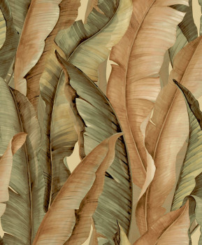 Vliesová tapeta s vinylovým povrchem, tropické listy v odstínech hnědé, okrové a zelené.