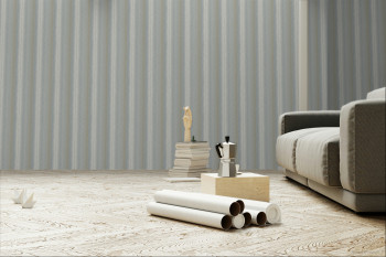 Jemně plastická, pruhovaná, modro-šedo-hnědá, vliesová tapeta s vinylovým povrchem, místy metalické stříbřité odlesky.