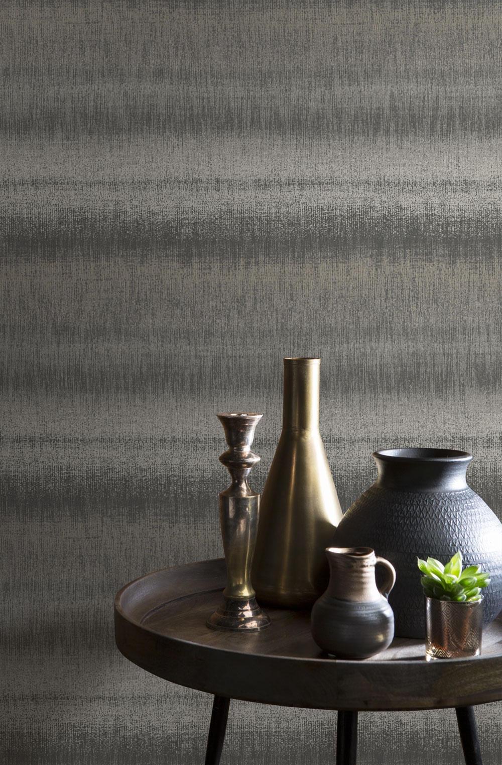 Jemně plastická, pruhovaná, šedo-hnědo-černá, vliesová tapeta s vinylovým povrchem, místy metalické stříbrné odlesky.