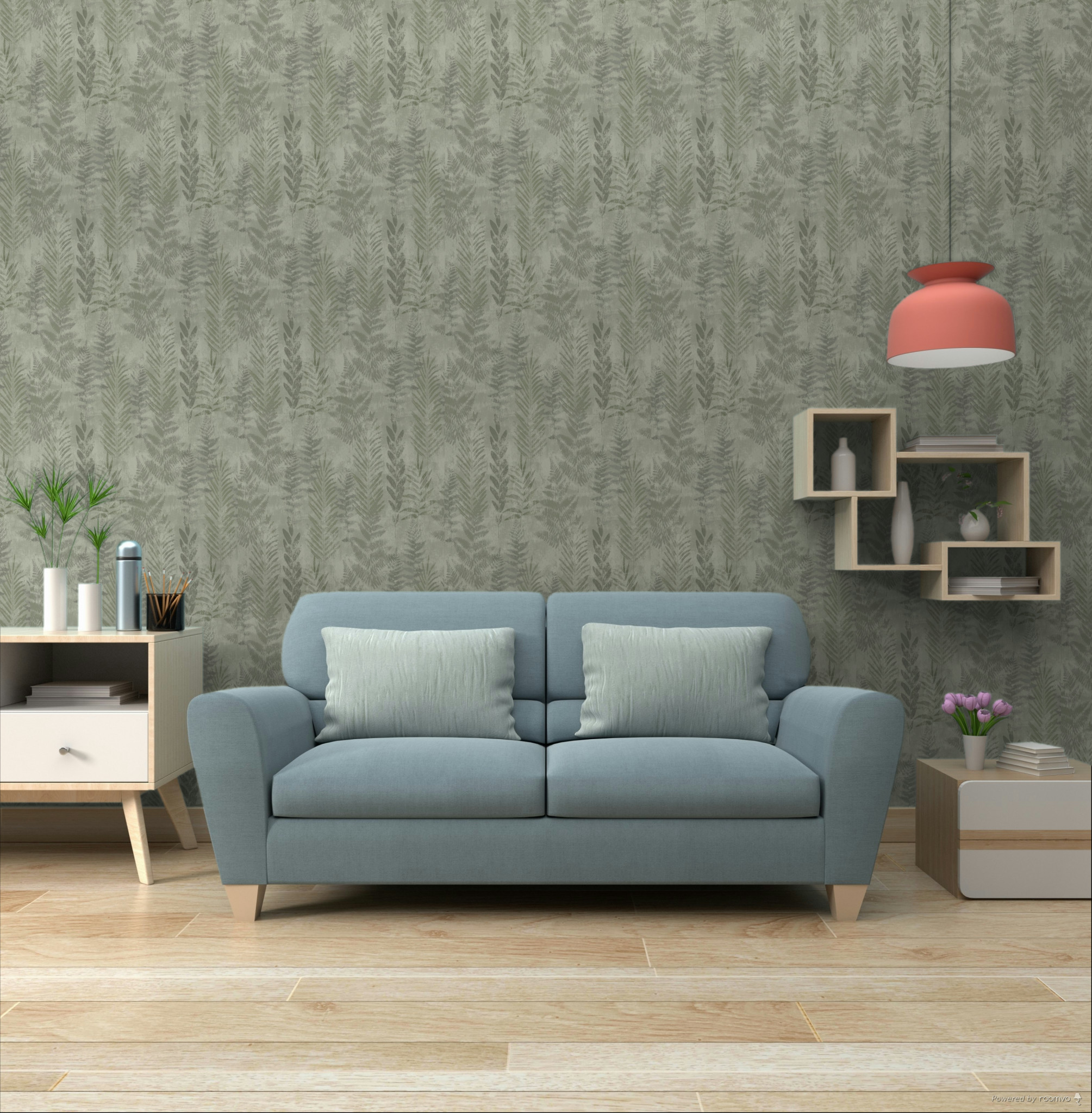 Jemně plastická zelená vliesová tapeta s vinylovým povrchem a motivy listů.