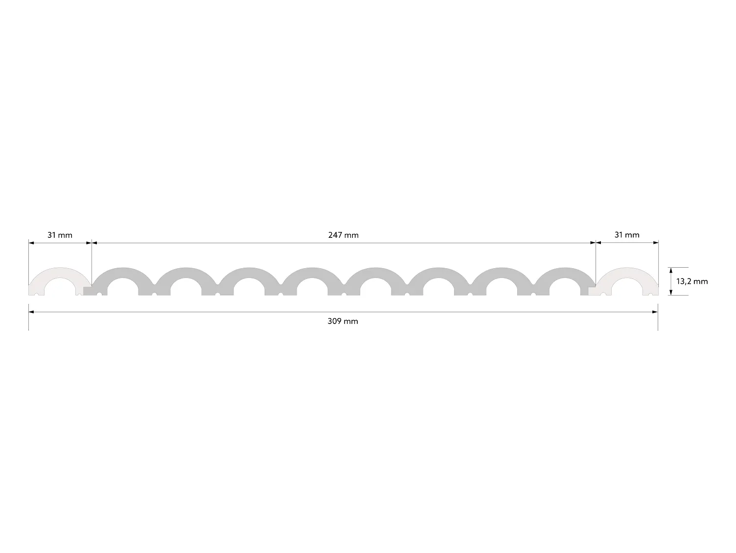 Nástěnné panely Duna mají konvexní vzor půlkruhů, což je vynikající alternativa k tradičním nástěnným dekoracím. Má saténovou vrstvu SupremeSatin®, která chrání povrch a dodává mu sněhově bílou barvu. Panely jsou odolné vůči vodě, UV záření a mechanickému poškození.