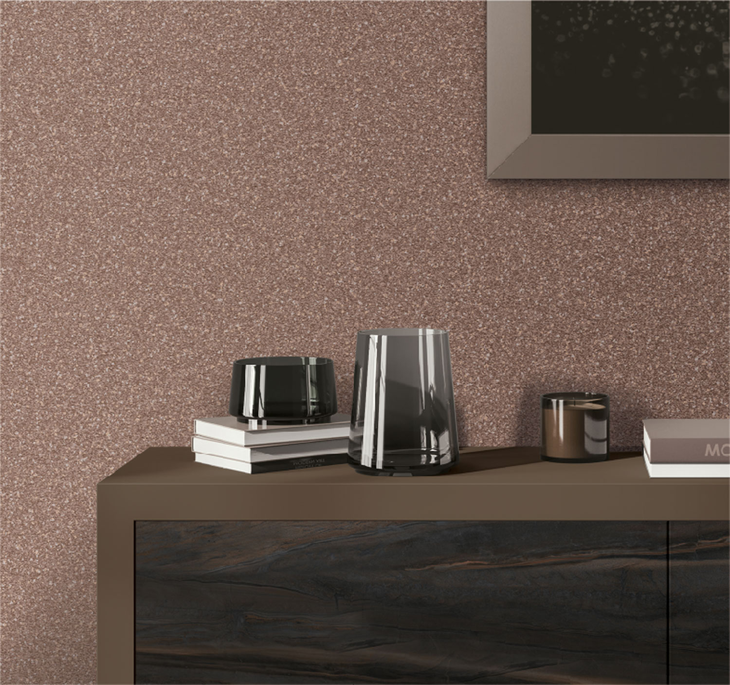 Luxusní vliesová tapeta se strukturou imitující minerální křemennou texturu s drobným leskem v cihlové barvě. Podklad vlies, povrch omyvatelý vinyl.