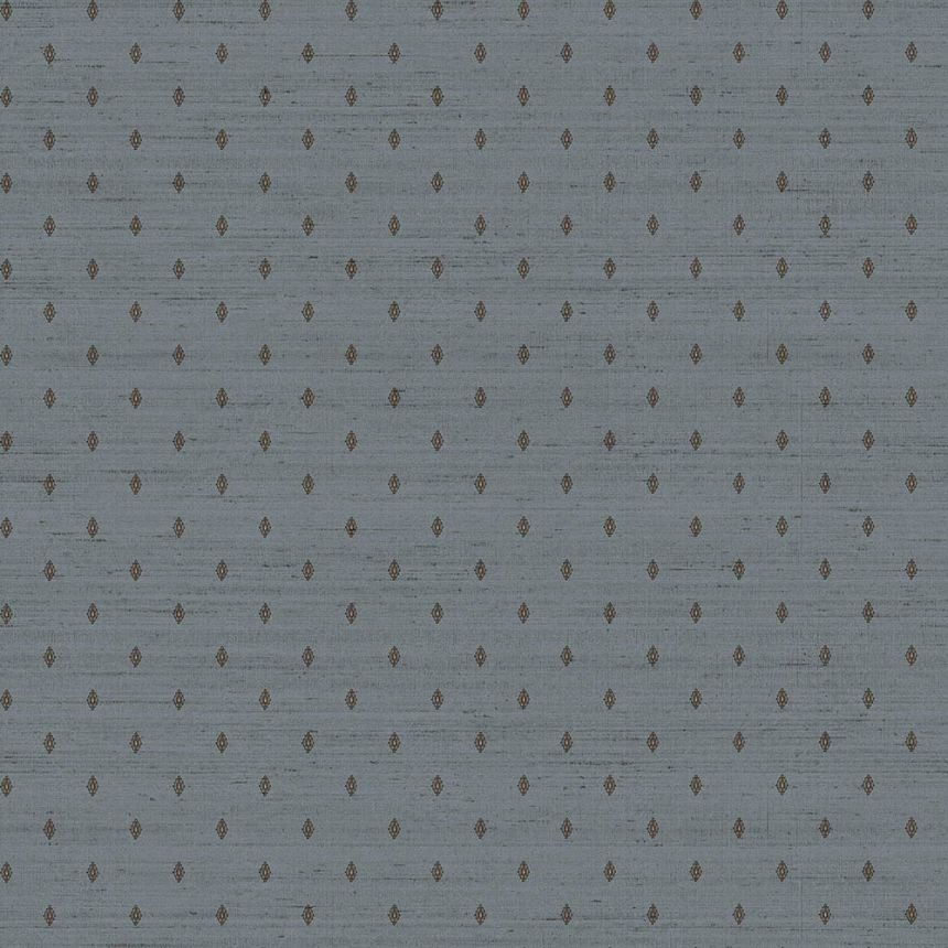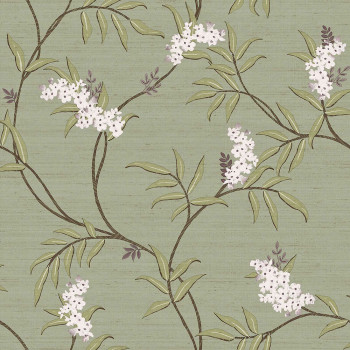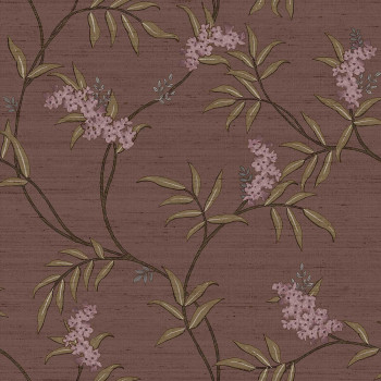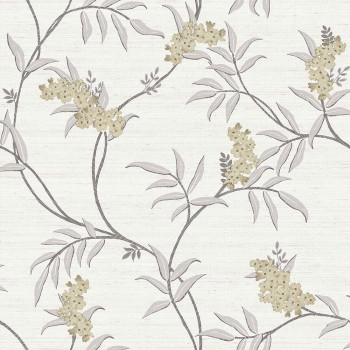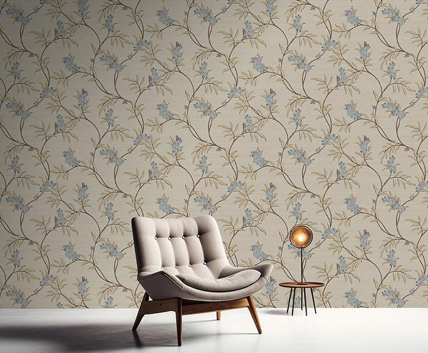 Luxusní písková vliesová tapeta s vinylovým povrchem, efekt jemné textilie s rozkvetlými větvičkami v odstínech metalické zlaté, hnědé a šedo-modré.